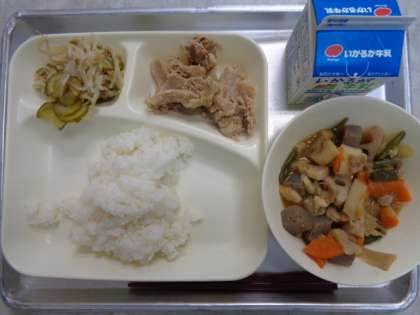 ♦ぶたにくのねぎじょうゆやき♦ふきよせに♦きゅうりともやしのあまずあえ♦ごはん♦ぎゅうにゅう