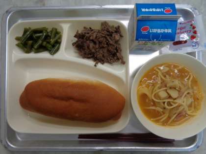 ♦ぎゅうにくのこうみやき♦ほたてがいとトマトのスープスパゲッティ♦さんどまめのサラダ♦コッペパン(添加物:いちごジャム)♦ぎゅうにゅう