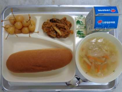 ♦なすのミートグラタン♦けいにくとやさいのスープ♦さくらんぼのかんづめ♦コッペパン(添加物:マーガリン)♦ぎゅうにゅう