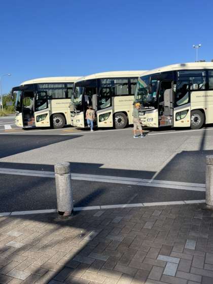 少し疲れた様子の子どもたちや、おしゃべりを楽しむ子どもたち、トイレ休憩を終えバスにもどっていきました。