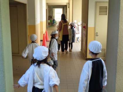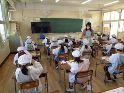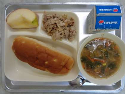 ♦ぶたにくのオイスターソース焼き♦ちゅうかみそスープ♦りんご♦おさつパン♦ぎゅうにゅう