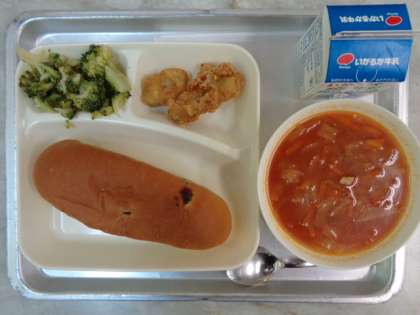 ♦しろみざかなのフリッター♦ミネストローネ♦ブロッコリーのサラダ♦レーズンパン♦ぎゅうにゅう