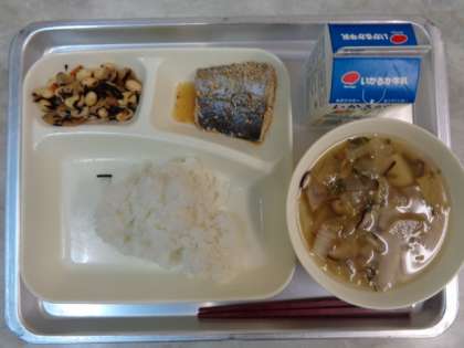 ♦さごしのごましょうゆかけ♦ごもくじる♦だいずのにもの♦ごはん♦ぎゅうにゅう