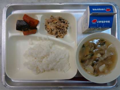 ♦ぶたにくとほしずいきのみそに♦うすくずじる♦やきかぼちゃのあまみつかけ♦ごはん♦ぎゅうにゅう