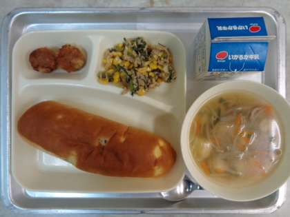 ♦あげシューマイ♦ちゅうかスープ♦ツナとチンゲンサイのいためもの♦おさつパン♦ぎゅうにゅう