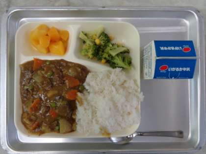 ♦ふゆやさいのカレーライス♦ブロッコリーとコーンのサラダ♦おうとうのかんづめ♦ぎゅうにゅう