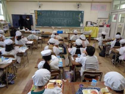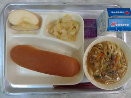 ♦カレーうどん♦はくさいのおひたし♦りんご♦コッペパン(添加物:ブルーベリージャム)♦ぎゅうにゅう