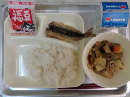 【今日の給食では、節分の行事献立として「いわしのしょうがじょうゆかけ」と「いり大豆」が登場しました。】