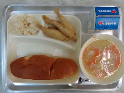 ♦わかさぎフライ♦コーンとはくさいのスープ♦カリフラワーのサラダ♦おさつパン♦ぎゅうにゅう