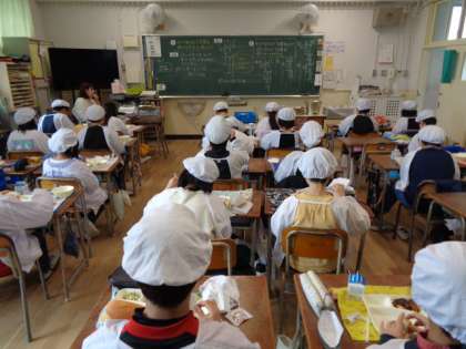 給食の焼きプリンは、卵、牛にゅう、クリーム、さとうをまぜ合わせ、カラメルソースの上に入れ、むし焼きにしています。プリンの表面にできるほのかなこげ目が特ちょうです。
