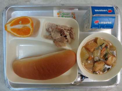 ♦ぶたにくのオイスターソースやき♦あつあげとやさいのちゅうかに♦デコポン♦コッペパン(添加物:アプリコットジャム)♦ぎゅうにゅう