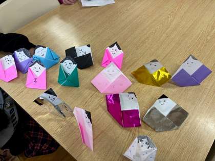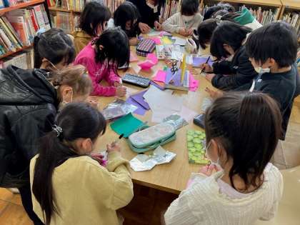お昼休み時間中に図書館開放に来た子どもたちが、学校司書の先生から指導を受けてひなまつりの折り紙を作りました。