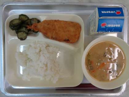 ♦いわしフライ♦みそしる♦きゅうりのあかじそあえ♦ごはん♦ぎゅうにゅう