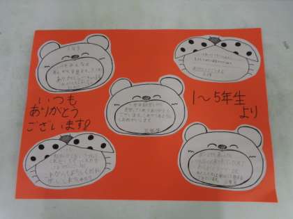 1年生から5年生まではそれぞれ学年を代表して3名ずつの子どもたちが、6年生は各クラスの子どもたちが、日々の感謝の気持ちを寄せ書きにしました。