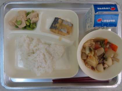 ♦さごしのおろしじょうゆかけ♦さといもとやさいのふくめに♦こうやどうふのにもの♦ごはん♦ぎゅうにゅう