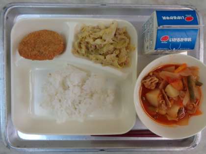 ♦チキンレバーカツ♦ケチャップに♦ツナとキャベツのバジルソテー♦ごはん♦ぎゅうにゅう