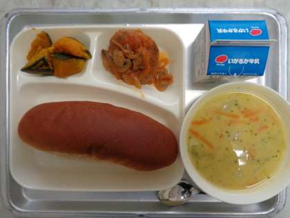♦にこみハンバーグ♦コーンとキャベツのスープ♦やきかぼちゃ♦こくとうパン♦ぎゅうにゅう