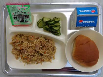 ♦やきそば♦きゅうりのしょうがづけ♦ソフトくろまめ♦こくとうパン(小)♦ぎゅうにゅう