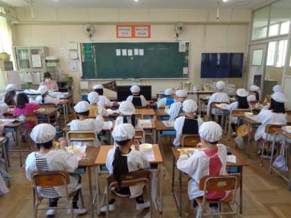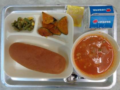 ♦ケチャップに♦さんどまめとコーンのソテー♦やきかぼちゃのあまみつかけ♦コッペパン(添加物:アプリコットジャム)♦ぎゅうにゅう