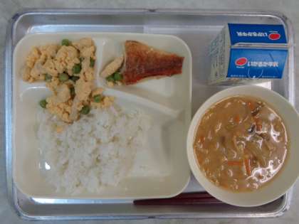 ♦あかうおのしょうゆだれかけ♦みそしる♦えんどうのたまごとじ♦ごはん♦ぎゅうにゅう