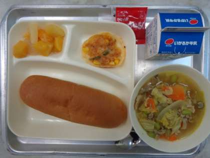 ♦ぶたにくとやさいのカレースープ♦かわりピザ♦ミックスフルーツのかんづめ♦コッペパン(添加物:いちごジャム)♦ぎゅうにゅう