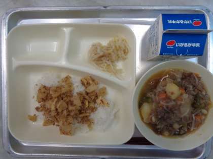 ♦にくじゃが♦もやしのゆずのかあえ♦ごまかかいため♦ごはん♦ぎゅうにゅう