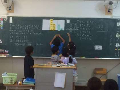 2年生は、「たし算とひき算のひっ算」の学習をしています。2けた+2けたでくり上がりが出てくる計算です。計算の仕組みを理解するために、半具体物を使ってみんなで考えて計算の仕方を探っていきます。