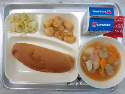 ♦いかてんぷら♦フレッシュトマトのスープに♦キャベツとコーンのソテー♦コッペパン(添加物:いちごジャム)♦ぎゅうにゅう