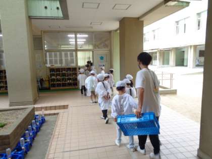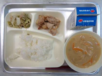 ♦けいにくのしょうゆバターやき♦みそしる♦やさいいため♦ごはん♦ぎゅうにゅう