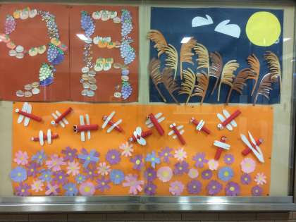 毎月、学年ごとで子どもたちと協力して、季節にあった掲示物を作成し、玄関ホールに掲示しています。学校に来られた際は、玄関ホールの掲示物をご覧ください。