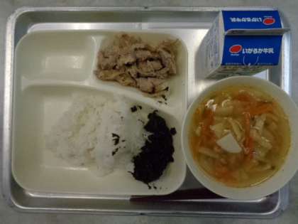 ♦ぶたにくのあまからやき♦ごもくじる♦のりのつくだに♦ごはん♦ぎゅうにゅう