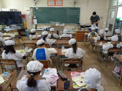 今日の給食では、さとうやみりん、しょうゆなどの調味料とだしを合わせ、しいたけときざみのりを入れて煮つめて作りました。ごはんがすすむ一品でした。