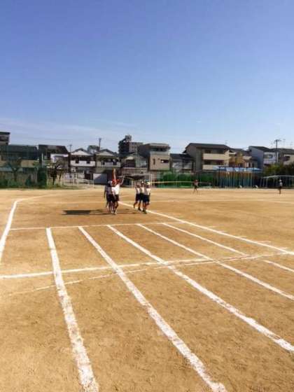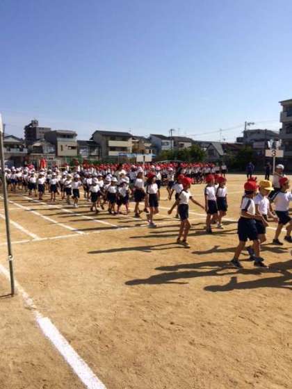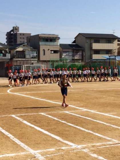 晴天の元、全体練習を行いました。入場行進から始まり、全員競技の「おくって おくって おととととと」(大玉送り)のまでの練習を行いました。学年だけの練習と違い、いい緊張感をもって練習を行うことができました。