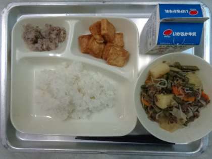 ♦にくじゃが♦あつあげのみそだれかけ♦キャベツのあかじそあえ♦ごはん♦ぎゅうにゅう