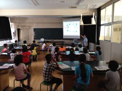 5月24日(金)今日はサントリーの方に学校に来ていただいて、4年生が水についての学習をしました。理科室でプロジェクターとスクリーンを使用してのわかりやすい授業に、子どもたちも熱心に聞き入っていました。