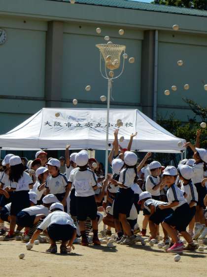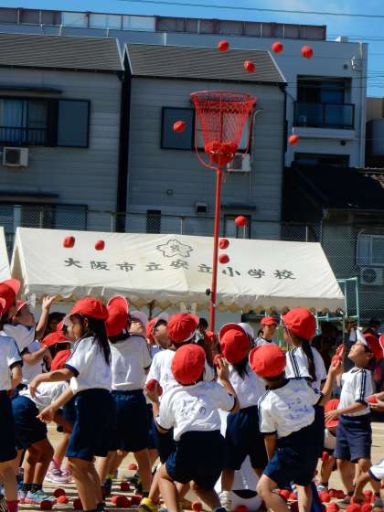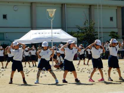 「チェチェコリ チェコリッサ」のリズムに合わせ一斉にダンス!かわいらしさあふれる1年生らしい玉入れでした。
