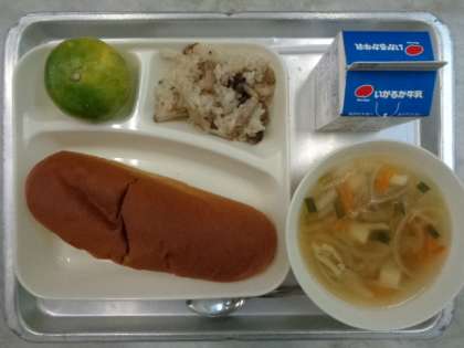♦きんときまめのちゅうかおこわ♦ちゅうかスープ♦みかん♦こくとうパン♦ぎゅうにゅう