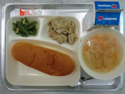 ♦ぶたにくのカレーふうみやき♦けいにくとやさいのスープ♦さんどまめとコーンのサラダ[ノンエッグドレッシング]♦パンプキンパン♦ぎゅうにゅう