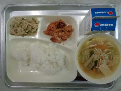 ♦けいにくのチリソースやき♦やきぶたとワンタンのかわのスープ♦きりぼしだいこんのごまからみづけ♦ごはん♦ぎゅうにゅう