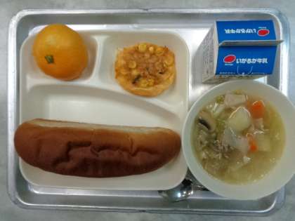 ♦ぶたにくとやさいのスープに♦かわりピザ♦みかん♦こくとうパン♦ぎゅうにゅう