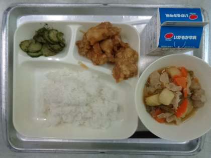 ♦あげどりのねぎだれかけ♦ぶたにくとじゃがいものにもの♦きゅうりのあかじそあえ♦ごはん♦ぎゅうにゅう