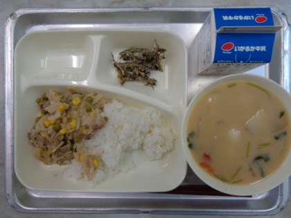 (今日の給食は、白みそで味をつけたぞう煮でした。)