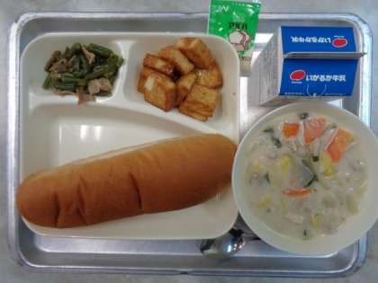 ♦はくさいのクリームに♦あつあげのピリからじょうゆかけ♦ぶたにくとさんどまめのオイスターソースいため♦コッペパン(添加物:マーガリン)♦ぎゅうにゅう