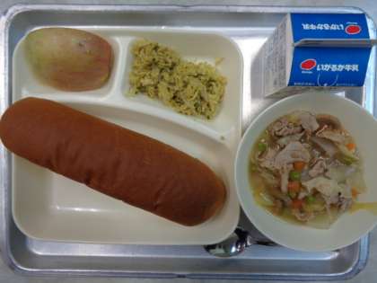 ♦ぶたにくとやさいのスープに♦カレーソテー♦りんご♦こくとうパン♦ぎゅうにゅう