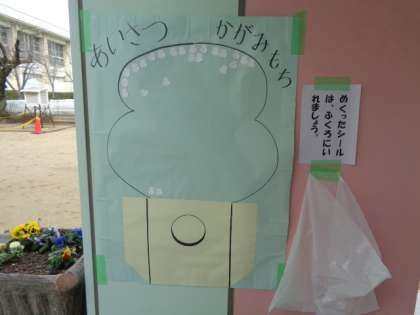 元気にあいさつができたら、児童会から小さなかがみもちシールが渡されます。かがみもちシールは、おみくじにもなっていて、門の近くにあるポスター(四ケ所に貼ってあります)にシールを貼ってかがみもちを完成させます。