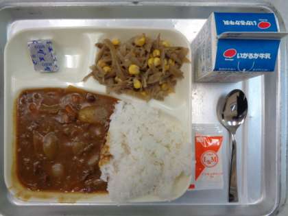 ♦ぎゅうにくときんときまめのカレーライス♦ごぼうサラダ[ノンエッグドレッシング]♦こけいチーズ♦ごはん♦ぎゅうにゅう