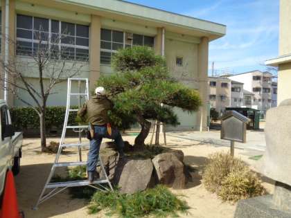 住吉の名物の一つである「なにわやの笠松」が本校の小運動場の一角ですくすくと生育しています。本日剪定が施されました。