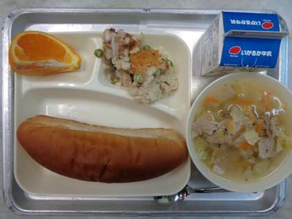 ♦おしむぎのグラタン♦ぶたにくとやさいのスープ♦デコポン♦こくとうパン♦ぎゅうにゅう