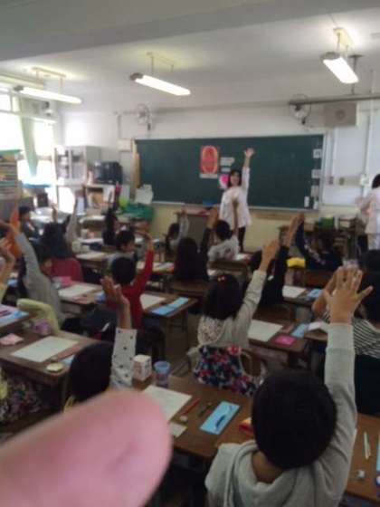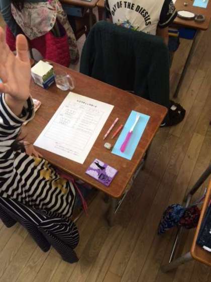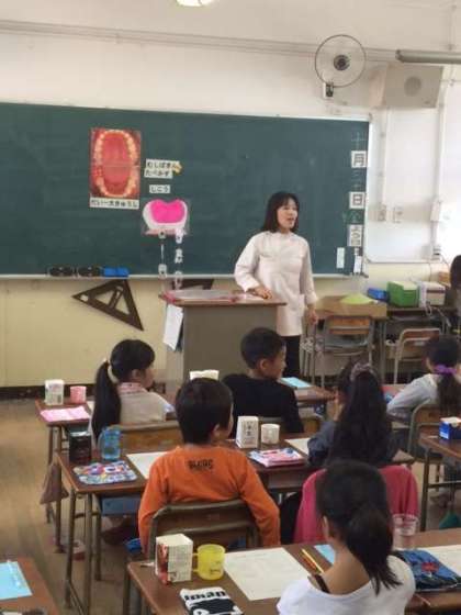 市教委から歯科衛生士の方が来られて、歯の教室を行いました。2年生に向けて「おやつの食べ方」や「ジュースのとり方」、「よい歯を保つためのコツ」などの話をしてくださいました。また、歯の染めだしテストを行い、自分の磨き方がよいかどうか確認しました。