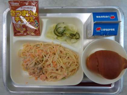 ♦さけのクリームスパゲッティ♦キャベツときゅうりのサラダ♦おさつチップス♦こくとうパン(小)♦ぎゅうにゅう